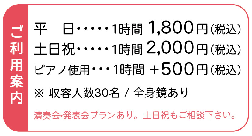 ピアノ演奏はもちろん楽器演奏会や動画撮影会等にご利用頂けます